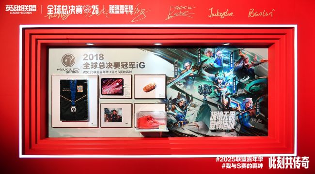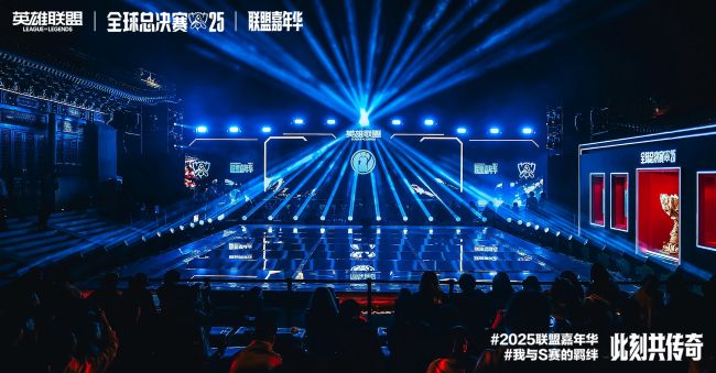 同时,现场还设置了展览区,该展览是官方联合发起的 “助威纪念物件” 征集活动成果 —— 前期不仅定向邀约Baolan、LWX、Jiejie 等传奇选手贡献私藏纪念物,更面向全网召唤师征集与 S 赛相关的情感载体,最终从海量投稿中精选出 100 份展品。现场,Baolan的冠军奖牌、 Tian 的 FMVP 奖杯、Flandre 的彩带球,还有玩家的 iG 项链、EDG 应援手幅、SN 赛事纪念币等物件整齐陈列。让观赛仪式不止于 “看比赛”,更成为召唤师们共享电竞记忆、凝聚应援力量的情感阵地。 下午三点左右,“传奇登场・荣光启幕” 开幕仪式开启。伴随 LPL 赛区主题曲,主持人正式开场,之后 Baolan、LWX、Jiejie 隆重登场,分享 S 赛记忆并为出征战队送祝福。仪式高潮,全场灯光渐暗,特制 “金沙漏” 开始流转,细沙填满容器的瞬间,漫天金色彩带如 “金色雨” 洒落,大屏同步播放 LPL 出征战队视频,现场召唤师举起应援助威棒,用呐喊与灯光汇成金色海洋,氛围推向顶点。