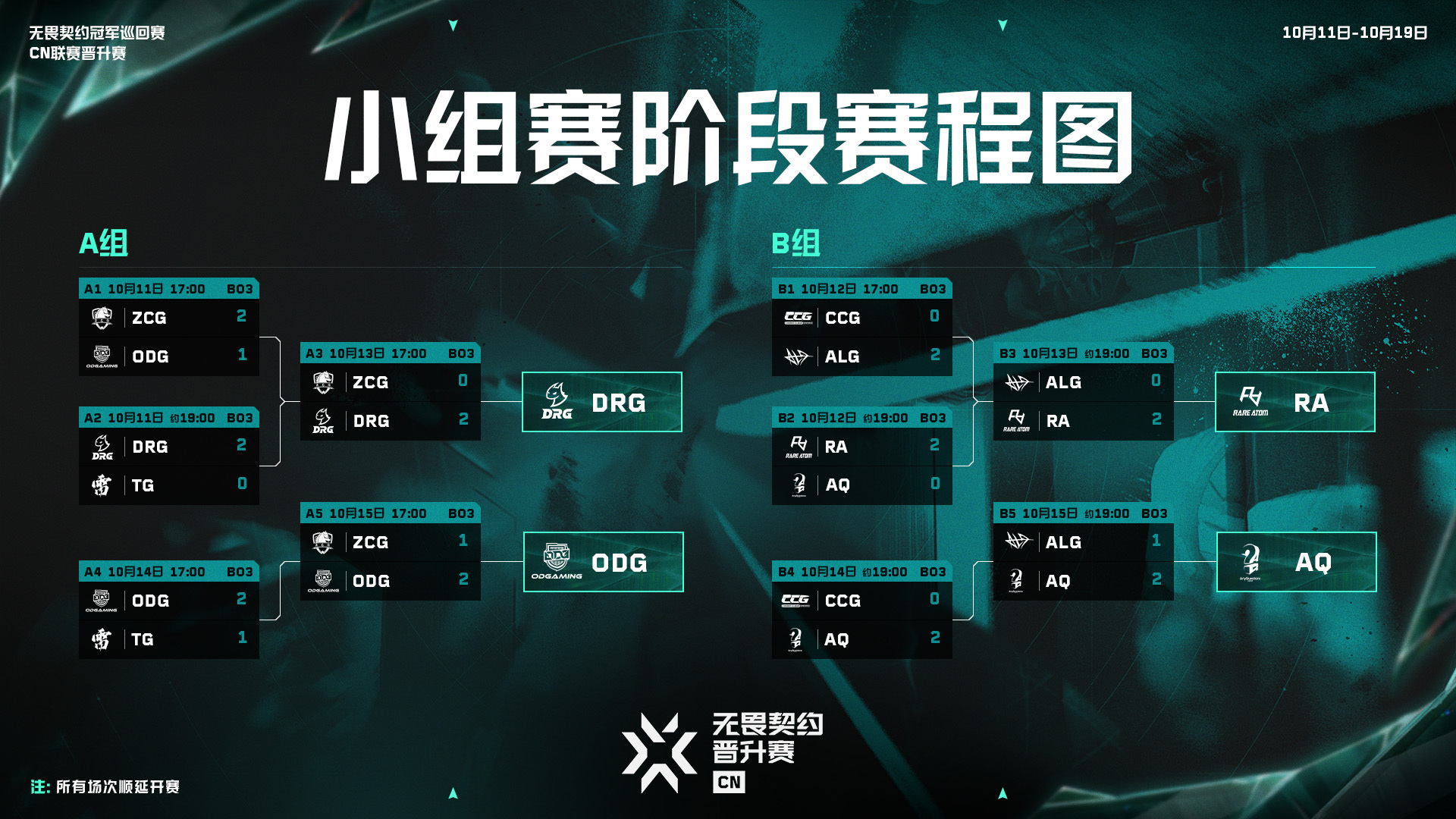 10月17日第一场胜者组决赛上,与AQ多次交锋的RA延续了开赛以来的火热手感,以2-0的比分力压对手AQ,获得直接进入VCT CN联赛晋升赛总决赛资格。第二场败者组半决赛的比赛,DRG快速调整状态以2-0力克对手ODG,从败者组突围晋级败者组决赛,再次对阵AQ争夺最后一个晋级总决赛名额。
