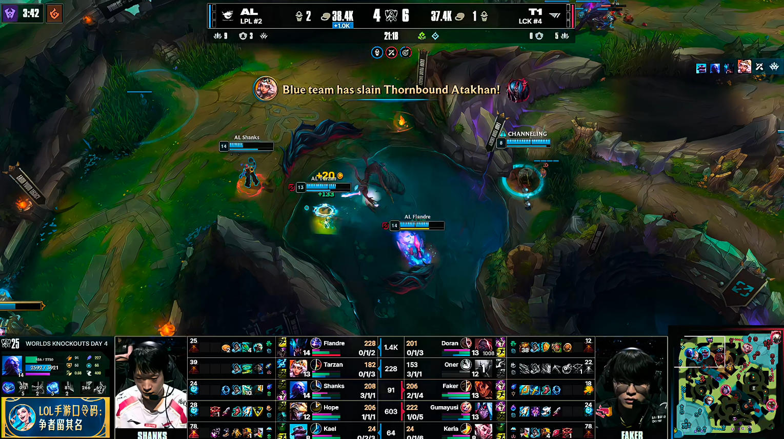 比赛20分钟厄塔汗争夺,AL没能抢到但打赢团战,将Oner与Keria两人击杀。AL直接冲进野区开团,在野区狭小路口Faker冰鸟直接输出拉满,配合上德莱文的追击输出,T1团灭AL大获全胜。